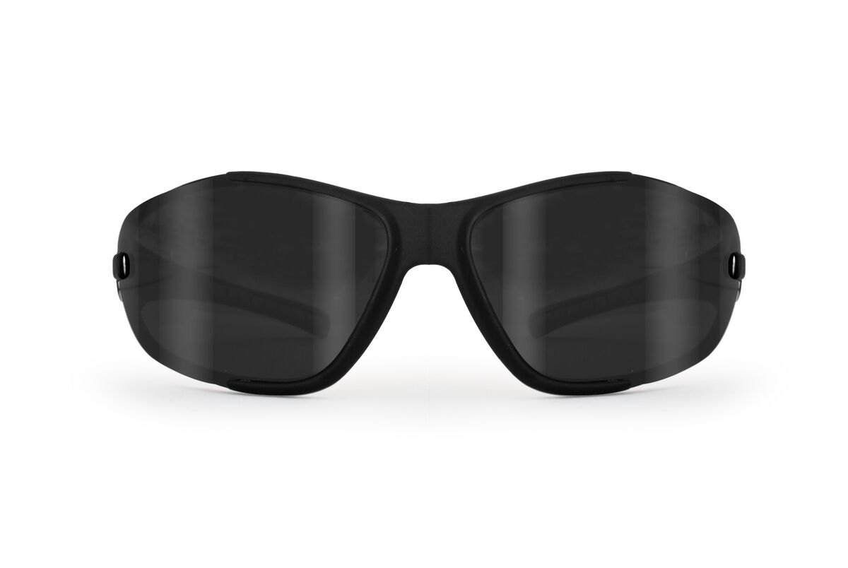 Sport sunglasses with interchangeable lenses by Bertoni Italy AF109. Made in Nylon mash stress-resistant and impact-resistant, extremely light. This special material also ensures an exponential increase of the frame duration over time. Megol nose pad, double injection temples and sold with 3 antifog lenses included, smoke, yellow and clear: smoke for high brightness, yellow for fogging and medium/low brightness, clear for low brightness conditions. Those types of lenses are well appreciated by motorcycle drivers. Suggested Sports: motorbike, running, ski, paragliding. Bertoni provides lifetime after sale service for all Bertoni goggles and sunglasses.