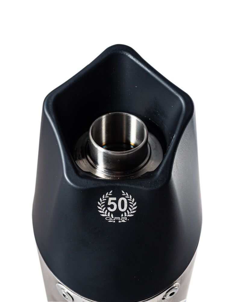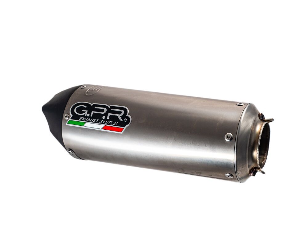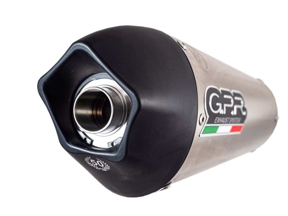 Homologated slip-on exhaustGP Ann.Titanium,born to celebrate the 50th GPR anniversary in 2018, conical shape from round diam. 90 to oval diam.130mm with pentagonal exit, made with titanium body and caps made in Avional obtained by CNC machiningOriginal GPR product, developed thanks to a long experience in World Motorbikes Championship, propose an innovative design, performance increase, relevant weight saving and a motorbike sound tone improvement.